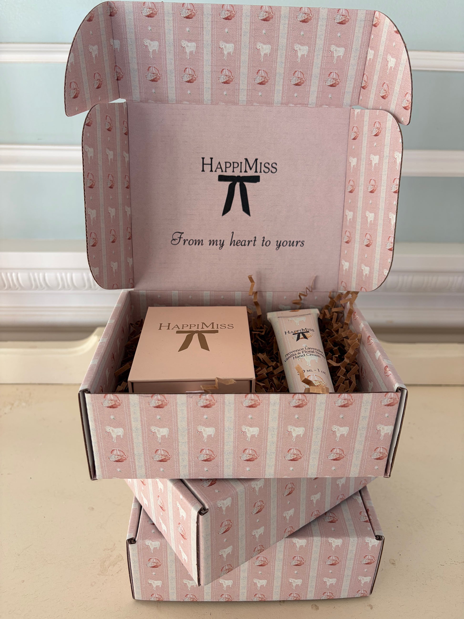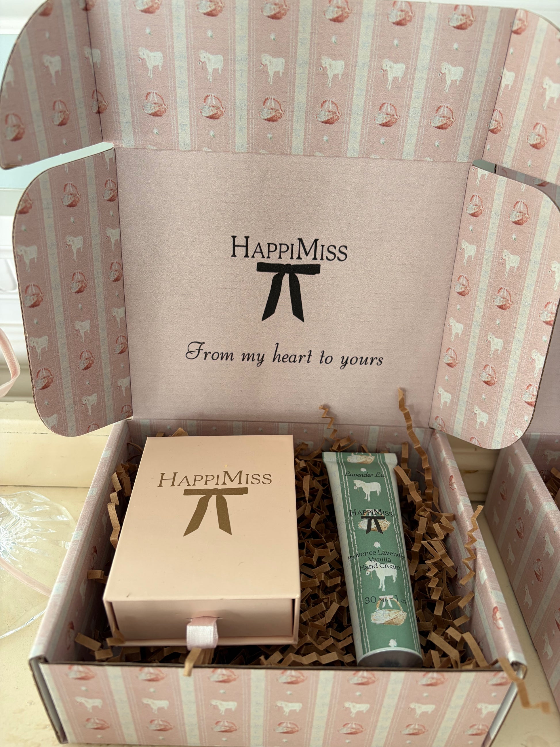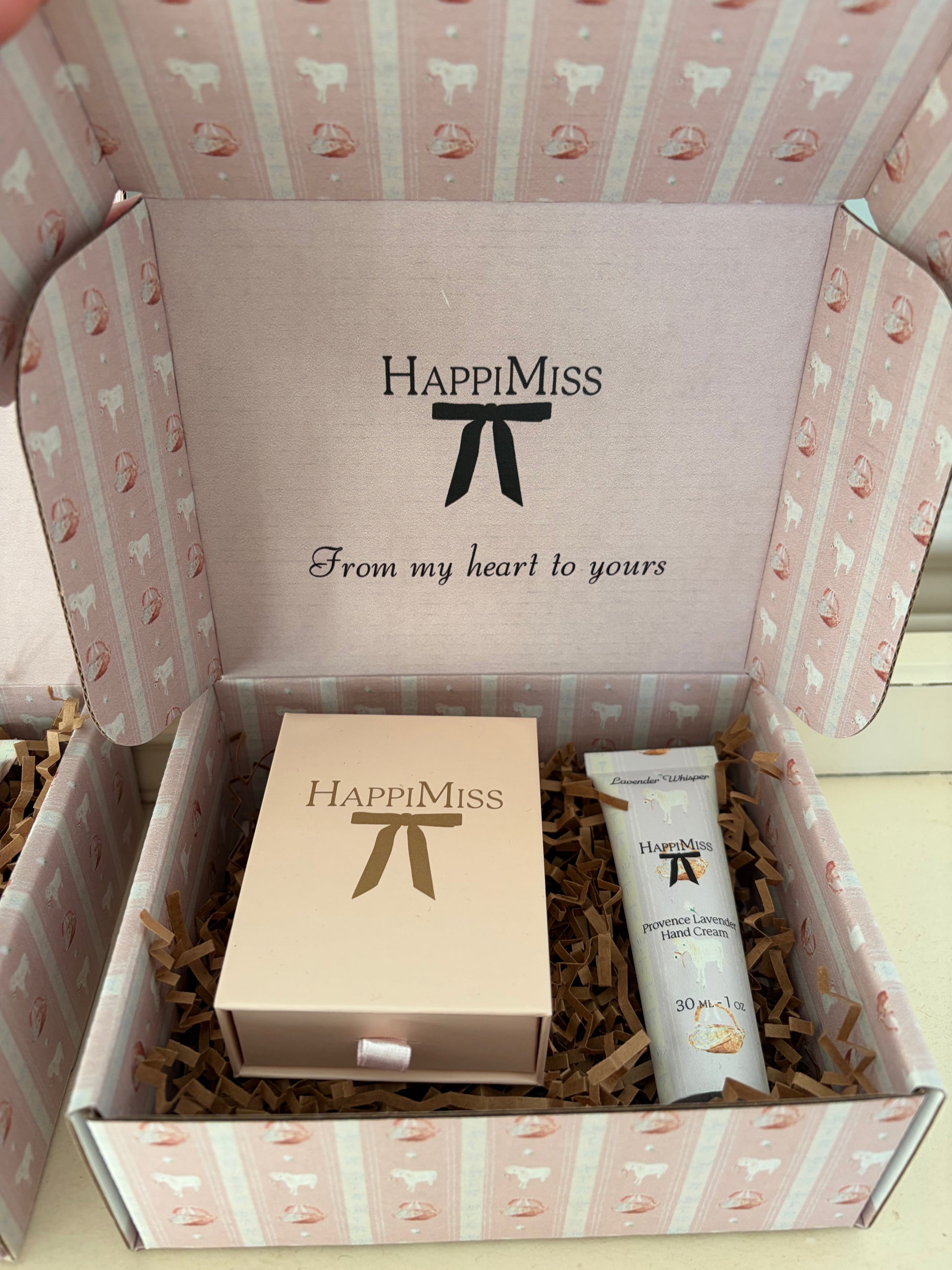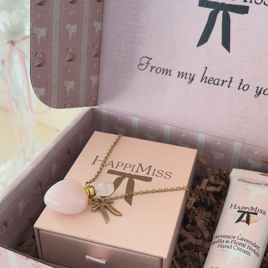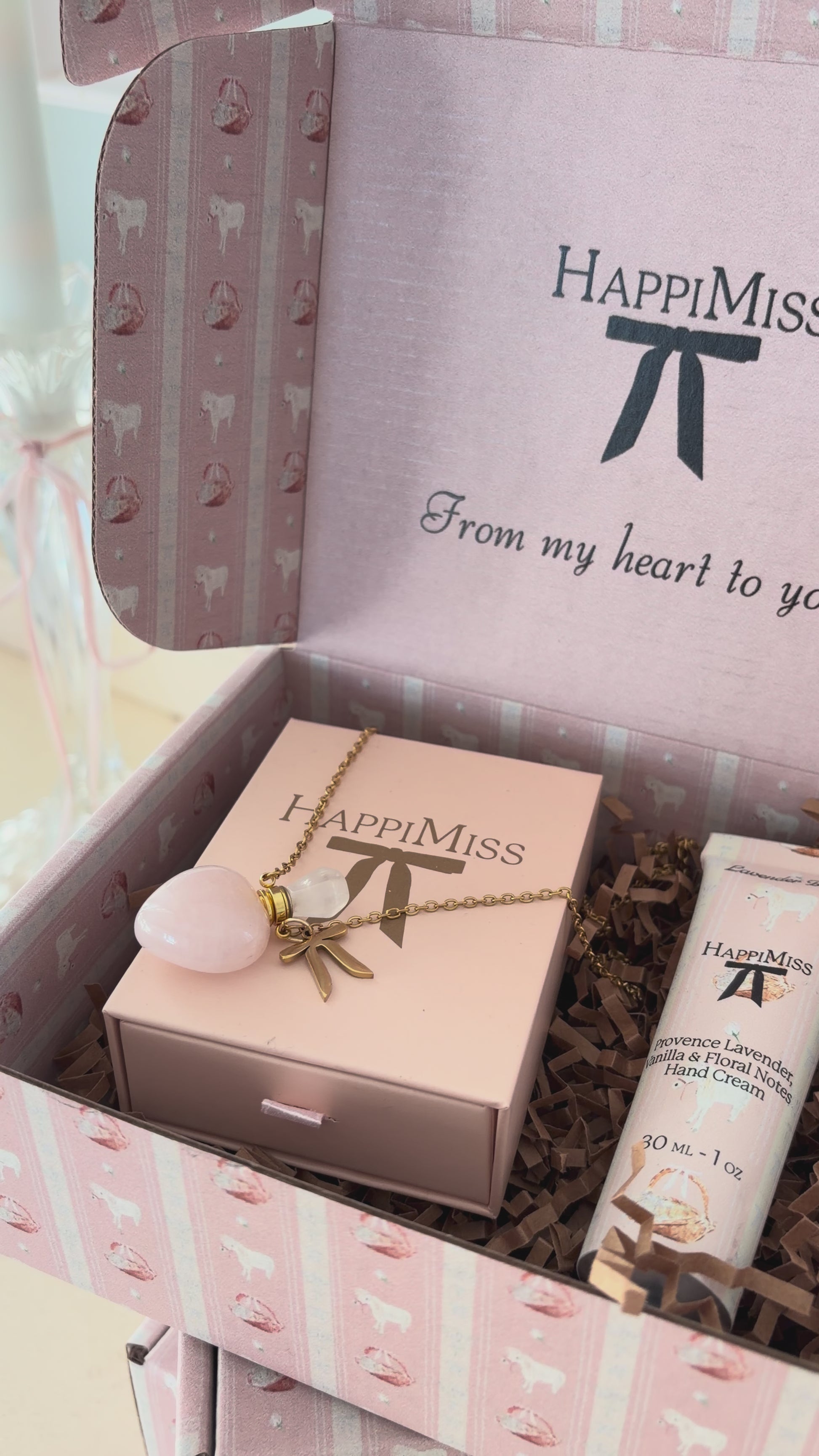 This limited-edition gift set features our rose quartz heart perfume necklace filled with our signature scent, HappiMiss Blush — a lavender-based fragrance with notes of cozy vanilla, pink grapefruit, soft rose, and intoxicating sandalwood.